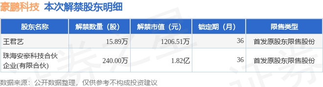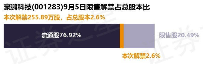 证券之星消息,根据市场公开信息整理,豪鹏科技(001283)于9月5日将有255.89万股限售股份解禁,为公司首发原股东限售股份,占公司总股本2.6%。(本次数据根据历史公告整理得出,实际情况以上市公司最新公告为准)最近一年内,该股累计解禁10.88万股,占总股本的0.11%。本次解禁后,公司还有2020.04万股限售股份,占总股本20.49%。具体如下图所示: